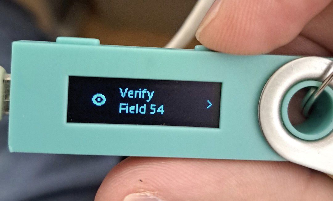 This enables applications to define message schemas with fields that are understandable by humans — a significant improvement over blind signing. However, even with this improvement, the signing process can still be overwhelming. See the image below: it shows a hardware wallet asking the user to verify the 54th field while signing a Gnosis Safe transaction — and that’s not even the last one. No one is realistically going to verify every single field.
